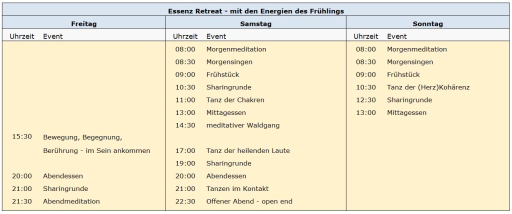 Wir freuen uns auf unser „Essenz Retreat – mit den Energien des Frühlings“ im April – eins von 3 Wochenenden im kommenden Jahr. =)