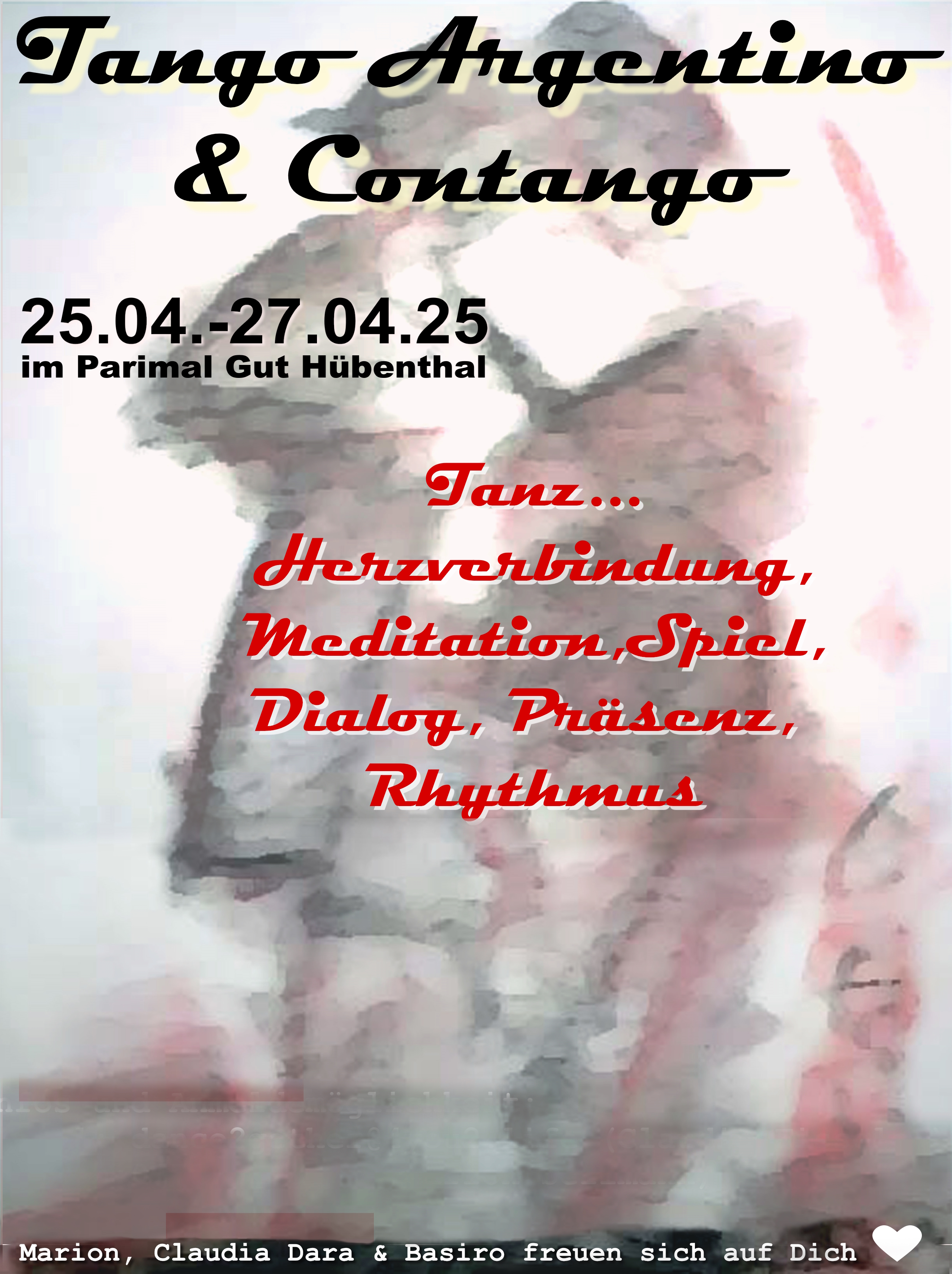 Wir bieten Donnerstags, um 19 Uhr, im Parimal, im wöchentlichen Wechsel „Tango Flow -Tango Argentino ein meditativer Herzenstanz“ und „Tanzen im Kontakt, Tango, Contango“ an. Wenn du kommen magst, melde dich bitte bis Mittwoch davor via E-Mail –tango.dance2gether@gmail.com – bei uns an